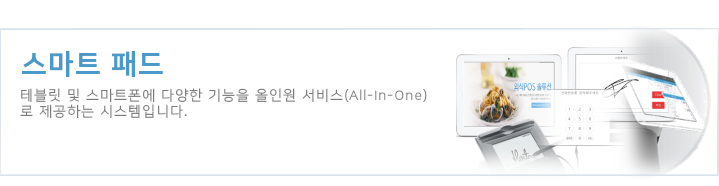 단일 장비로 다양한 기능들을 통합적으로 제공 가능합니다. 고객 정보를 고객이 직접 입력 (포인트 및 스템프 적립 및 확인) 서명 패드 기능 고객용 듀얼 모니터 (메뉴 이미지, 고객 주문 내역 표시 등) 대체 동영상 재생 고객에게 음성 안내 (영수증 필요합니까? 등) 안드로이드 기반 테블릿에 설치되며 보안리더기(IC)로 결제하는 VAN에서 사용 가능합니다.