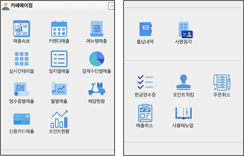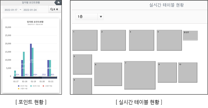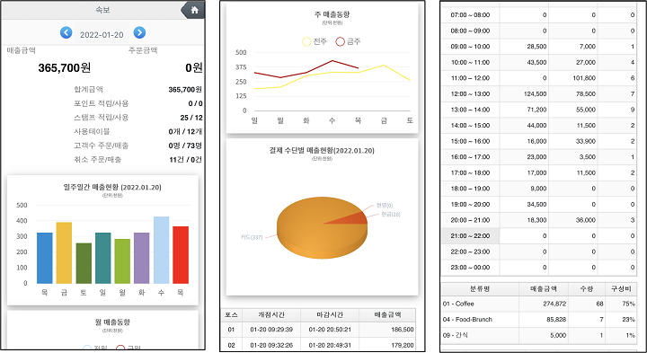 실시간 테이블 현황과 테이블에 주문한 메뉴,수량 등을 확인할 수 있습니다. 일자별 포인트,스탬프 적립/사용 현황을 차트로 한눈에 파악할 수 있습니다. 캘린더 매출, 메뉴별,일자별,결제수단별,영수증별,월별,신용카드별 등 매출을 자세하게 조회할 수 있습니다.