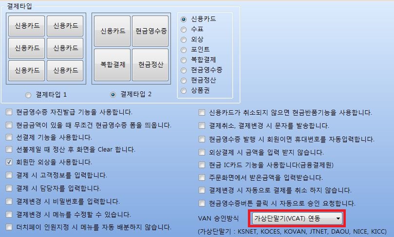 2. 관리프로그램 시스템관리-환경설정-POS환경-결제관련 VAN승인방식: 가상단말기 연동으로 설정