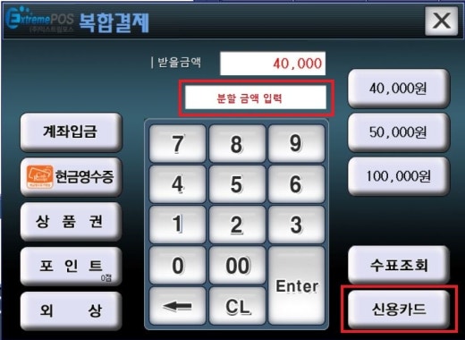 1) 복합 결제 창에서 분할 결제 할 금액 입력하고 신용카드 버튼을 누르면 승인 됨.